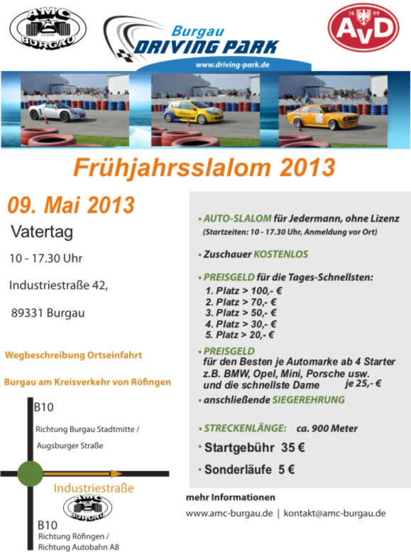 Wie jedes Jahr Veranstalten der AMC Burgau wieder einen Frühjahrsslalom aber nicht wie sonst am Pfingsten sondern dieses Jahr am Vatertag!! Auf ganz neu aspahltierter Strecke.