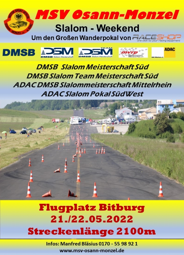 wir veranstalten am 21./22.05.2022 den 55. und 56. ADAC DMSB Slalom auf dem Flugplatzgelände in Bitburg.