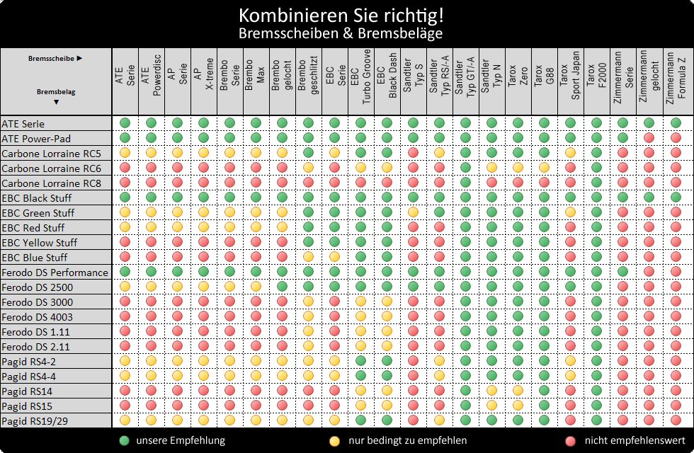 - EBC Black/Green/Red Stuff (rot und grün gerade noch für seriennahe Scheiben geeignet)