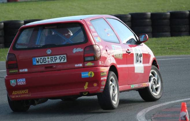 Angefangen hat alles mit einem Polo (6N, 60 PS, 8V), der mit vermeintlichem Getriebeschaden auf dem Hof stand. Da wir schon länger mal in den aktiven Motorsport reinschnuppern wollten haben wir den einfach genommen, ohne lange nachzudenken wie geeignet der jetzt ist. Die Maxime war es sollte ein VW sein und wir wollten jederzeit wieder aufhören können ohne allzu großen Verlust. Die ersten Teile wurden auf Ebay besorgt wie: Fahrwerk Bilstein B10, PU Buchsen, Sitze oder von Freunden geliehen z.B. 4-Punkt Gurt. Dann begannen wir alles leer zu räumen und ein gutes Jahr mit abbrechenden, weil festgegammelten, Schrauben zu kämpfen. Schnell merkten wir, dass liegend unterm Auto und ohne Werkzeug irgendwie doof ist und die Suche nach einer Werkstatt begann. Zeitgleich fuhren wir auf 8 Jahre alten Winterreifen unser erstes Training und zwei Wochen später unser erstes Clubslalom-Rennen in Braunschweig. Mittlerweile waren wir angefixt und vom Rennen ging es direkt in die Werkstatt. Jetzt -mit Hebebühne- vertrödelten wir aber erstmal den Winter, um in panischem Vorsaisonsstress schnell noch unser Käfig einzubauen (Safety First) eigene 4 Punkt Gurte zu montieren, einen K&N Sportluftfilter, anderen Auspuff zu montieren und Federal 595 RSR 195/50 R15 auf billige Alufelgen zu ziehen und eintragen zu lassen +10mm Distanzscheiben (möglichst günstig mit ABE). Des Weiteren musste das Schiebedach weichen und div. Aufkleber aufs Auto.