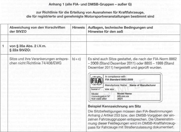 Wenn du jetzt wissen willst wie wir die Zulassungsfähigkeit für unseren nach FIA 8855 - 1999 hergestellten und geprüften Sitz nachweisen? Schauen wir in die "Richtlinie für die Erteilung von Ausnahmen nach § 70 Straßenverkehrs Zulassungs-Ordnung". Dort steht für Sitze und Verankerungen die nicht der Richtlinie 74/408/EWG entsprechen: "Es sind auch Sitze gestattet, die nach der FIA-Norm [...] 8855 - 1999 (Stand Dezember 2011) hergestellt und geprüft wurden.". Das kann jeder vor Ort durch den aufgebrachten Aufkleber kontrollieren. Für mich ist der Nachweis damit erbracht. Der entsprechende Auszug aus dem Verkehrsblatt hängt an. Der Rest (Gurte, Scheibenfolie) findet sich dort analog etwas tiefer.